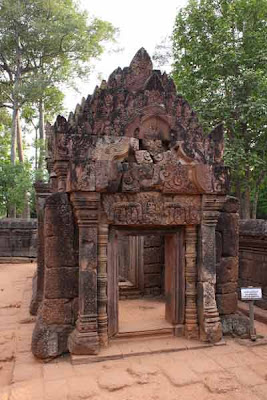 Banteay Srei is built largely of a hard red sandstone that can be carved like wood. Brick and laterite were used only for the enclosure walls and some structural elements. The temple is known for the beauty of its sandstone lintels and pediments.